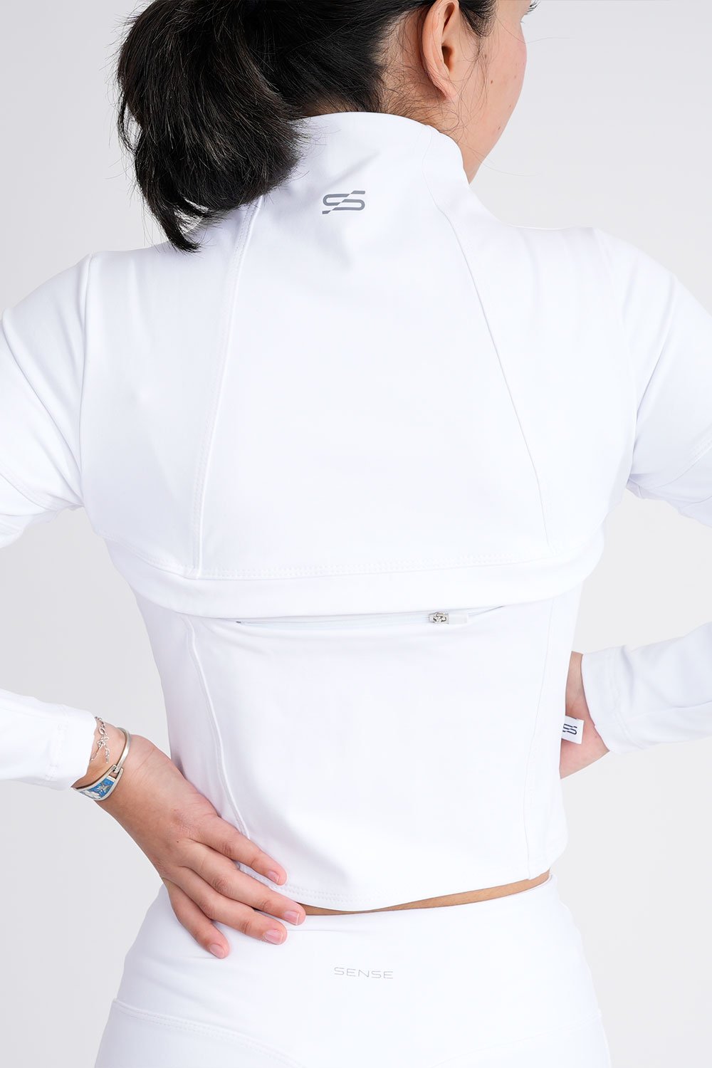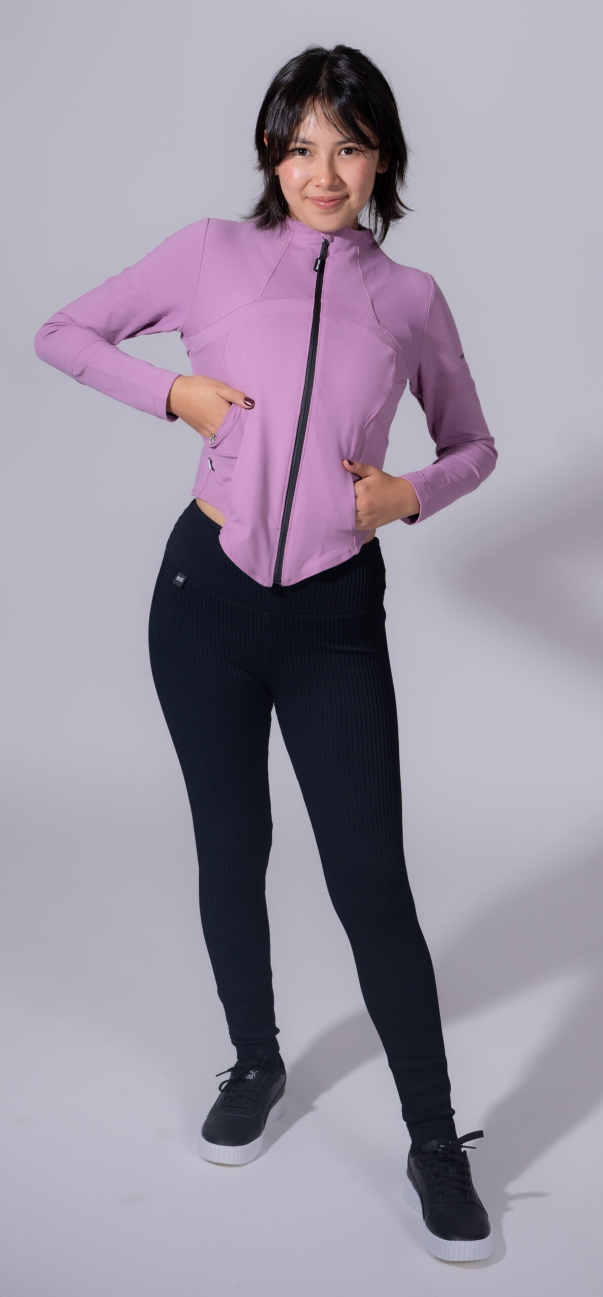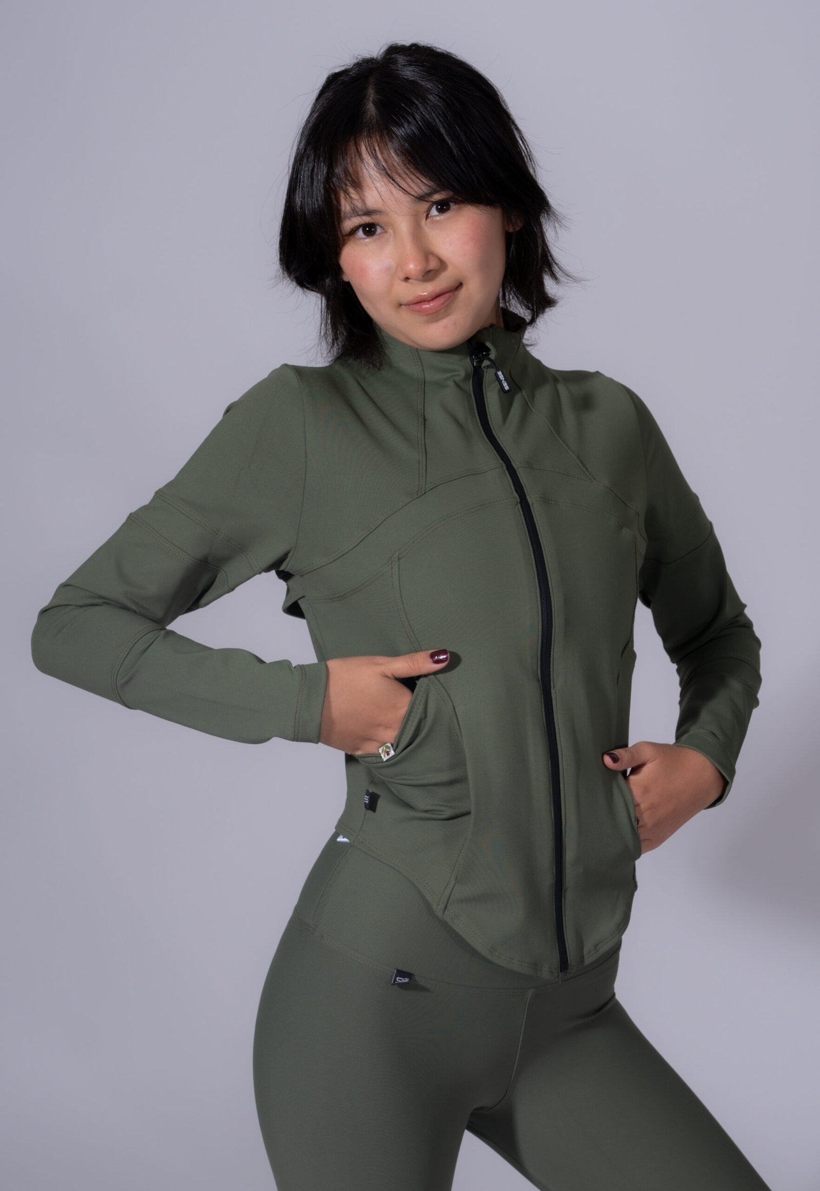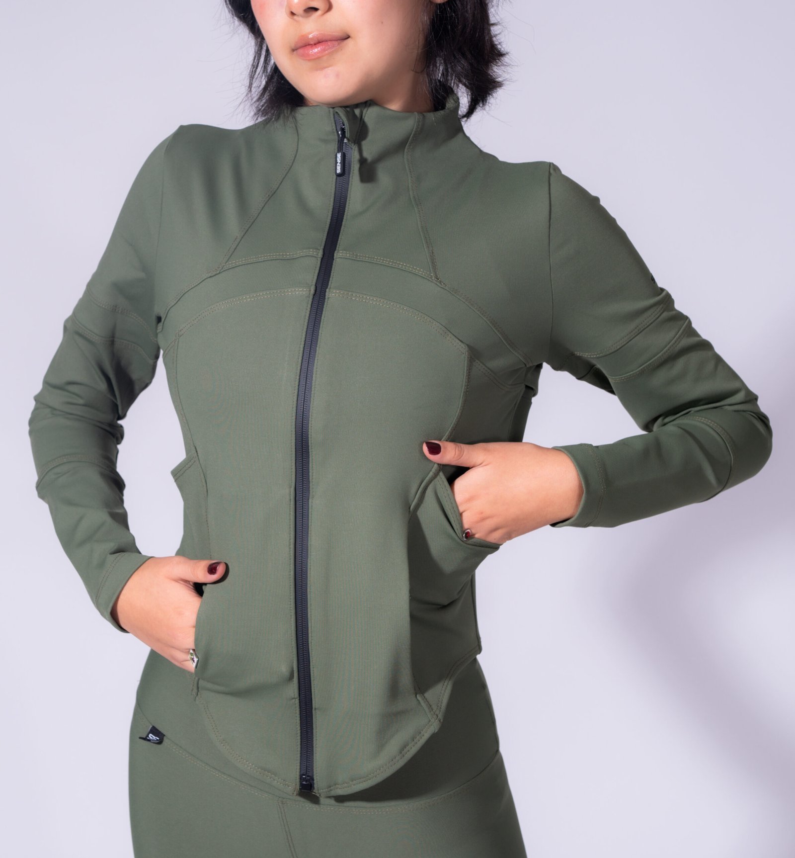 Cuello alto con cortes que estilizan la figura, múltiples bolsillos.